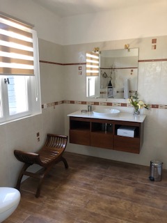 La salle de bain avec vasque, douche et toilettes.