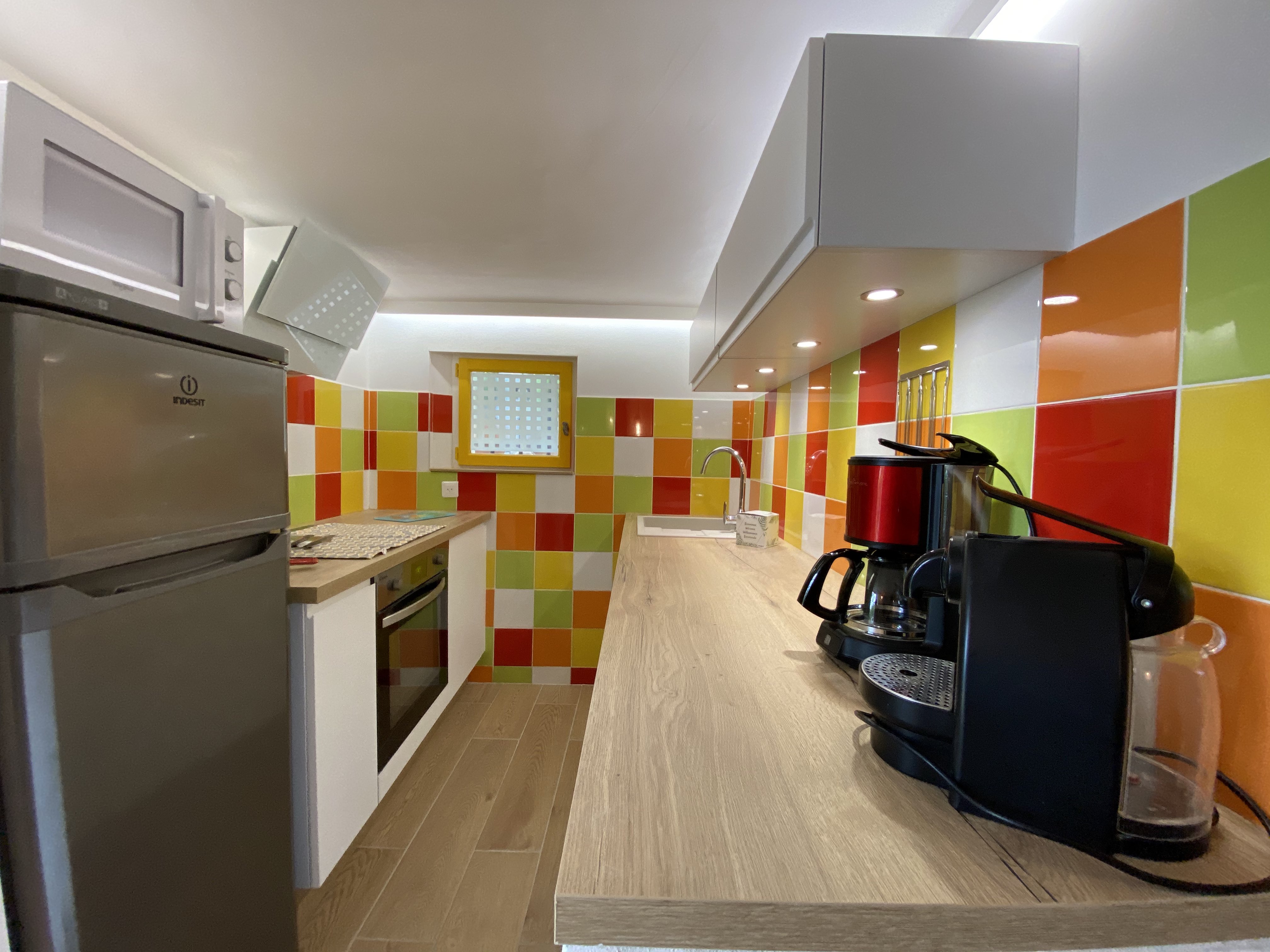 En RDJ, une pièce à vivre et une cuisine bien équipée (grand frigo, four, micro-onde, bouilloire, grille pain, cafetière à filtre et nespresso)