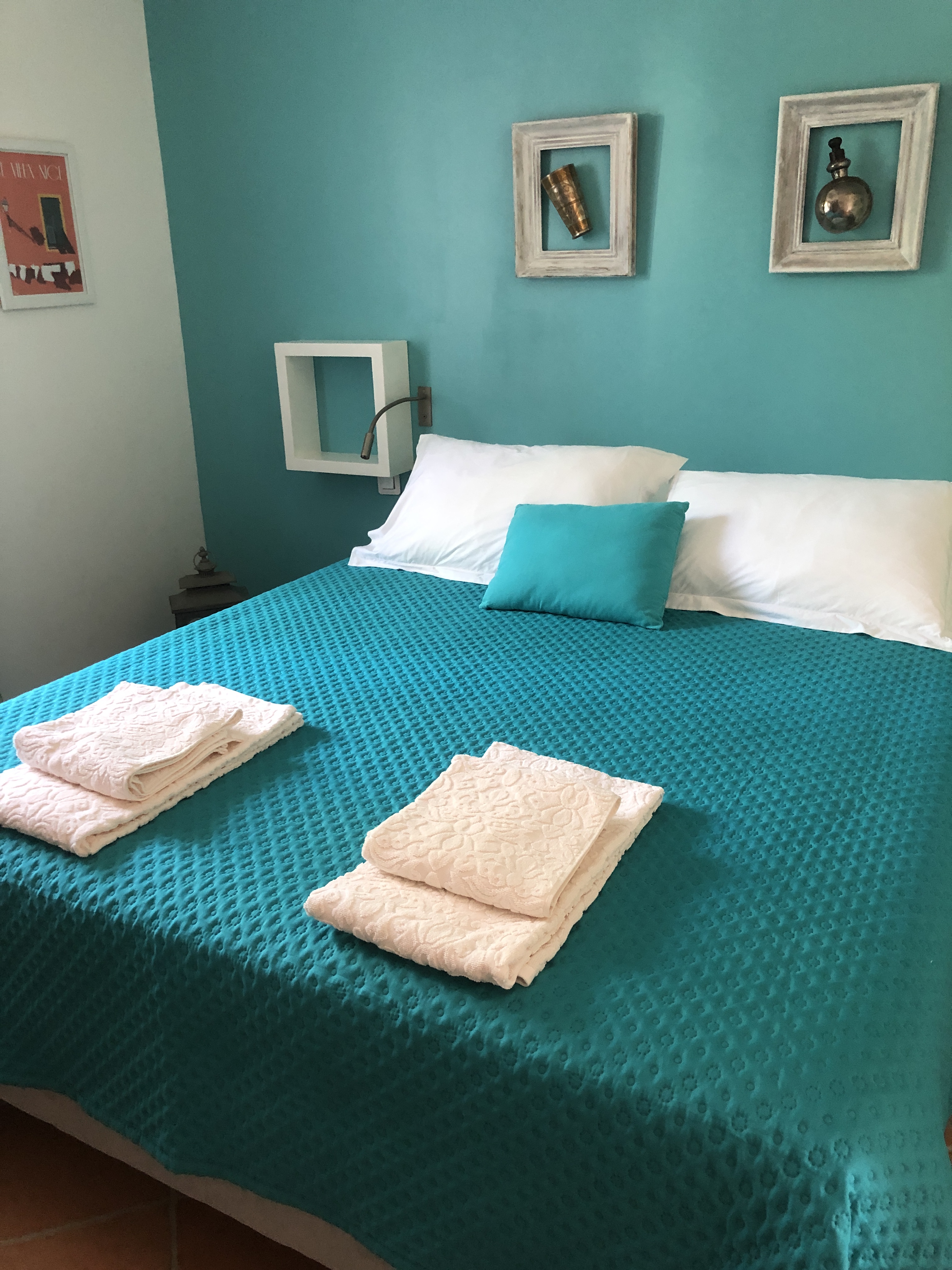La chambre N°1 (climatisée): avec un lit de 160/200 et un grand placard, tables de nuit, banc.